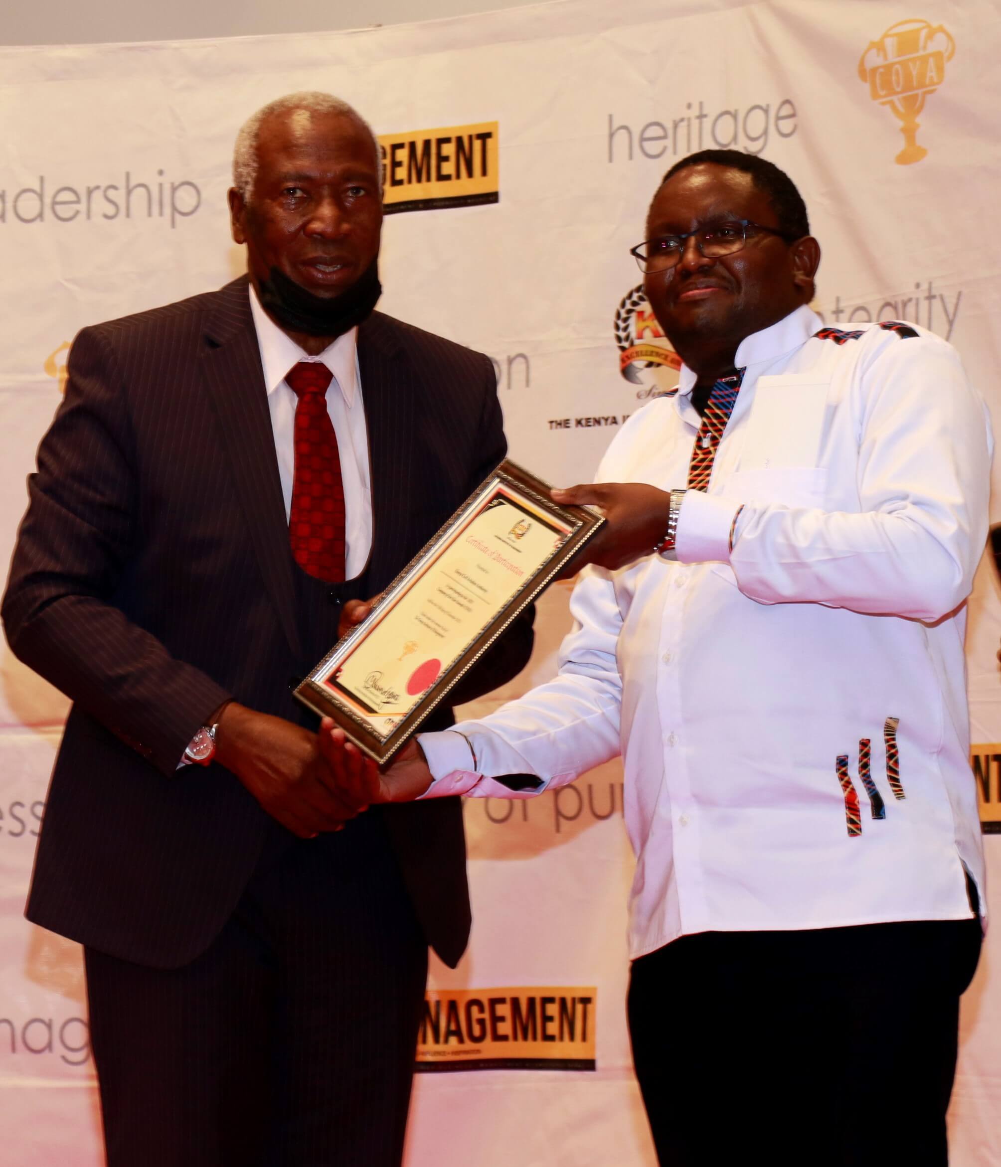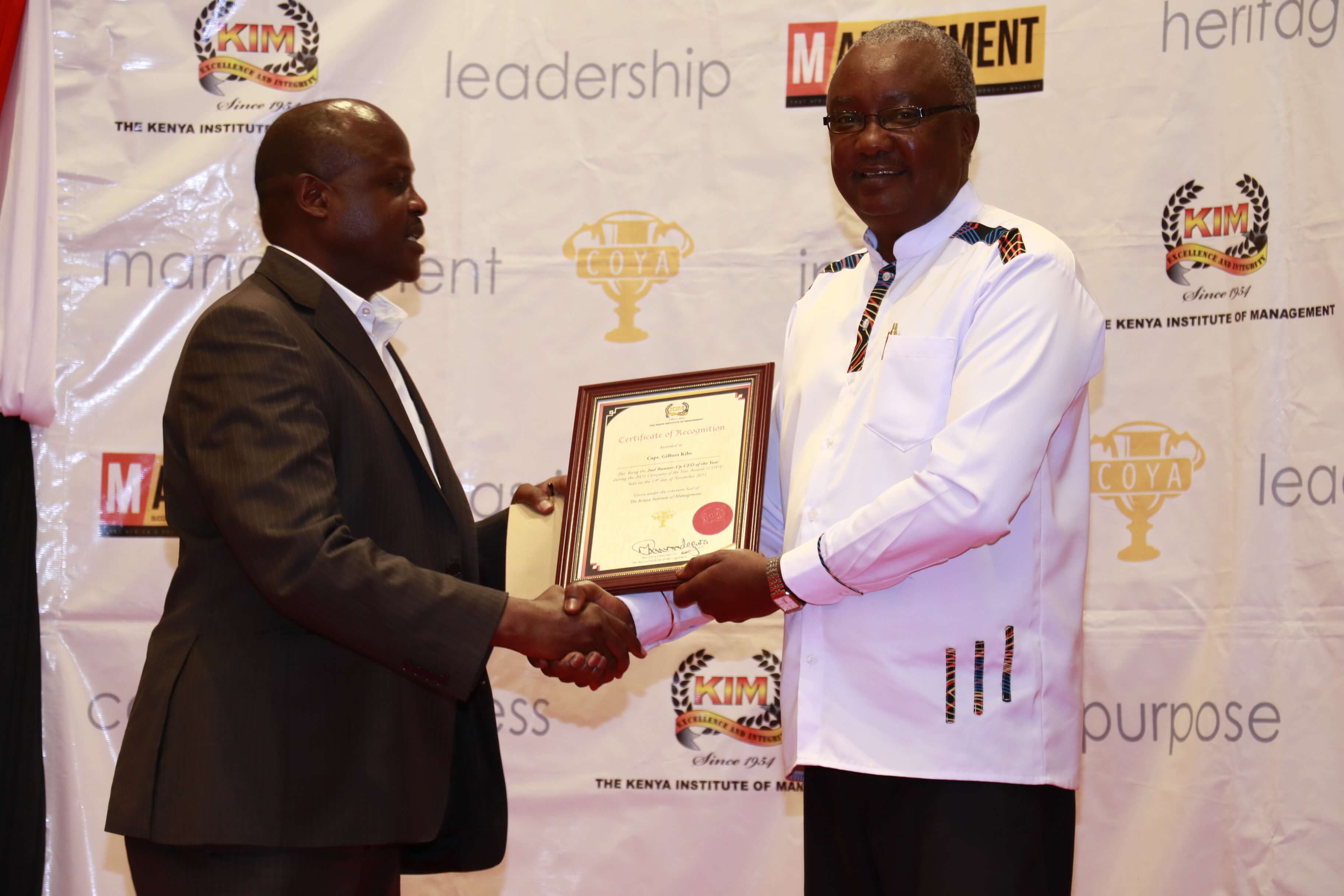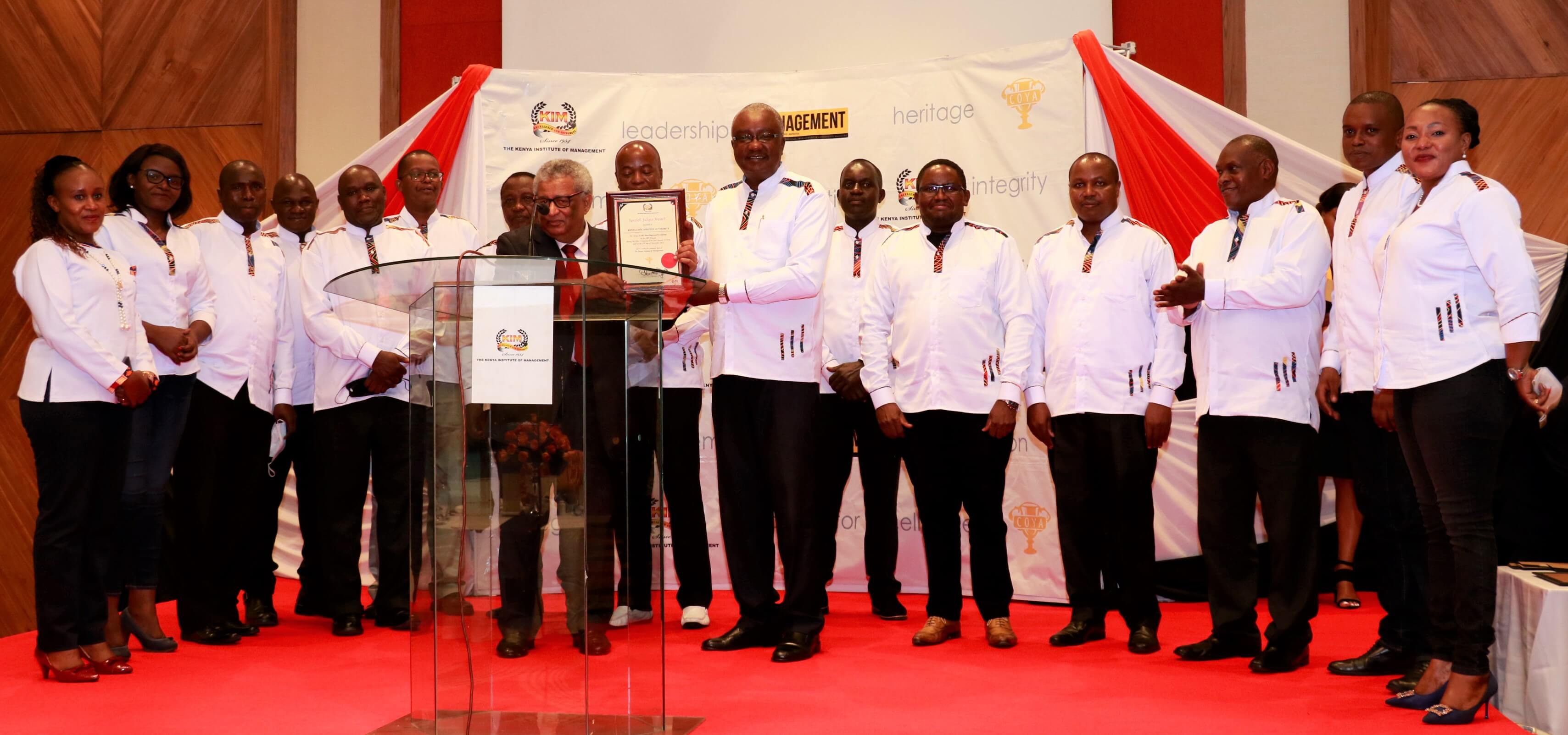 We are grateful to all our partners and stakeholders that made it possible for us to win and to the Kenya Institute of Management for organising COYA 2021. KCAA was awarded as the Most Improved Company, our Director General, Capt. Gilbert Kibe, emerged 2nd Runners Up in the best CEO category and our Corporation Secretary, Mr. George Mogaka emerged as the best overall Manager of the year.